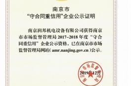 2020年2月26日,接到南京市企業(yè)信用管理協(xié)會通知,南京潤邦機電設(shè)備有限公司再次通過2017-2018年度市級“守合同重信用”企業(yè)的認定。誠信潤邦,傾心服務(wù)。