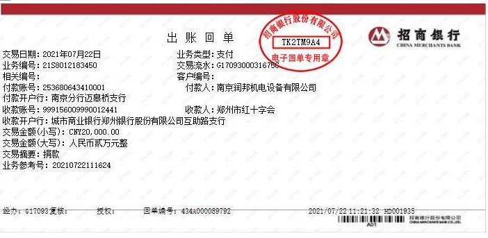 災(zāi)難面前,全國上下風雨同行,同舟共濟。7月22日,潤邦公司決定盡我們的綿薄之力馳援河南,通過鄭州市紅十字會捐款人民幣兩萬元整,用于保障受災(zāi)地區(qū)人民群眾的生命安全、緊急救災(zāi)物資采購等,助力鄭州市防汛救災(zāi)工作。
